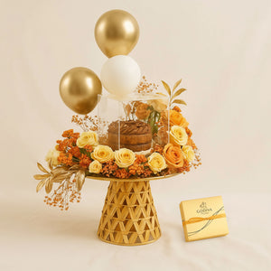 Elevate any celebration with our Flower Stand with Balloons & Chocolate Cake. This luxurious flower arrangement features a stunning gold stand adorned with elegant roses and balloons, paired with a decadent chocolate mini cake, making it a perfect centerpiece for any special occasion.