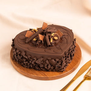 Enjoy a bite of happiness with a heart-shaped chocolate cake, made from the best types of chocolate