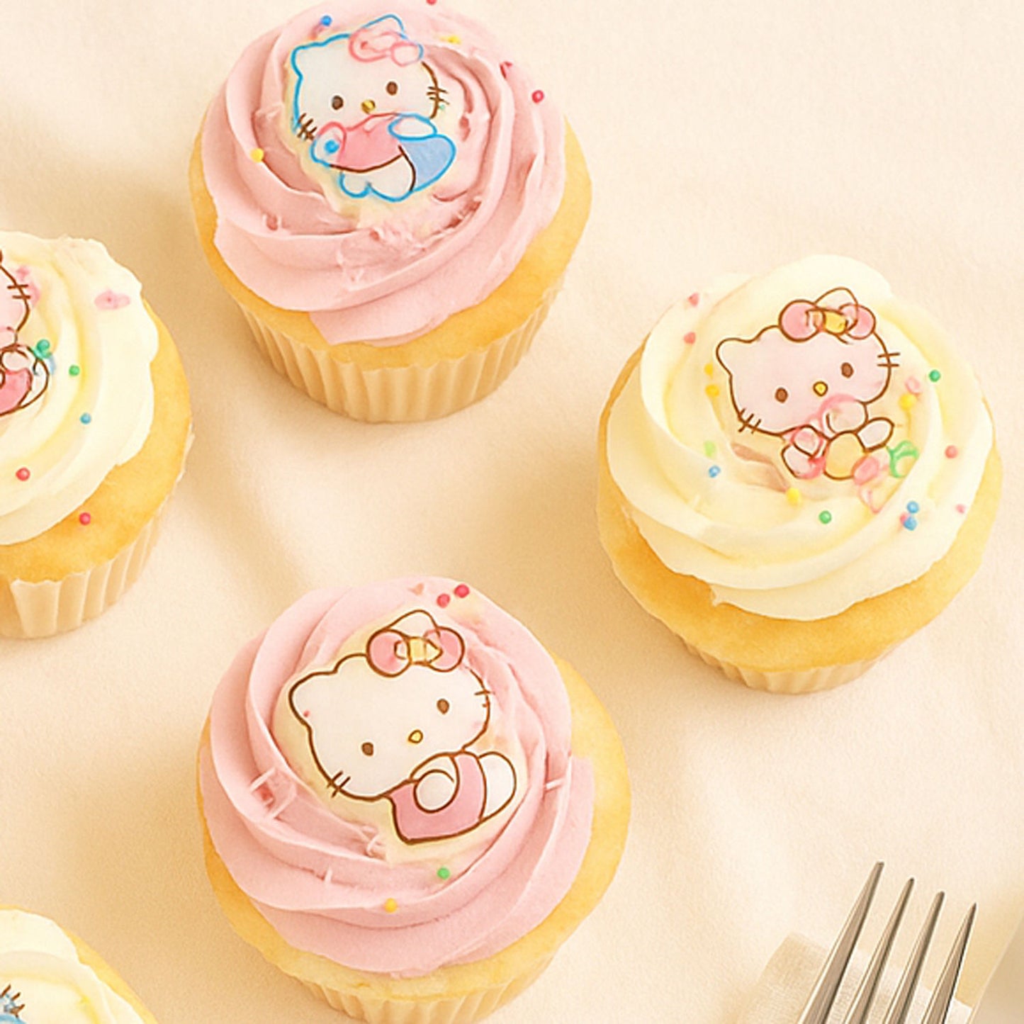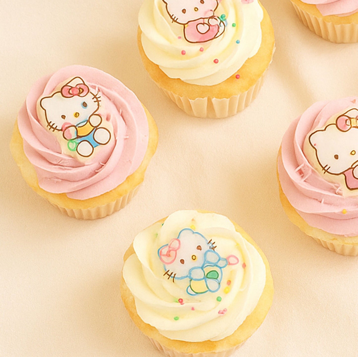 Cute Hello Kitty cupcakes with edible toppers of colorful sprinkles. Topped with Strawberry and Vanilla buttercream frosting
