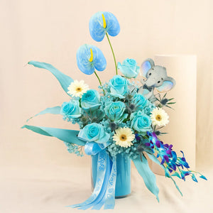 Welcome a newborn with our enchanting Newborn Gifts | Blue Roses Vase Arrangement. This charming arrangement features a delightful mix of blue roses, white flowers, and greenery, elegantly arranged in a glass vase. Adorned with baby-themed ribbons and a cute elephant cutout, it’s the perfect gift to celebrate the arrival of a baby boy.