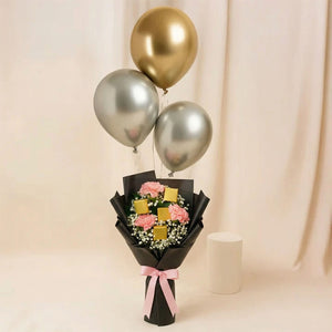 Charm your loved ones with this delightful fusion of sweet florals and decadent treats. This bouquet combines the soft elegance of pink carnations with the rich allure of golden-wrapped chocolates. The flowers and chocolates gift completed with a celebratory metallic balloons, making it a perfect gift for heartfelt birthday party, love celebrations, or graduation.
