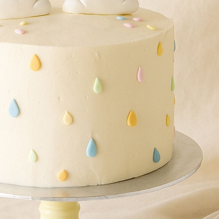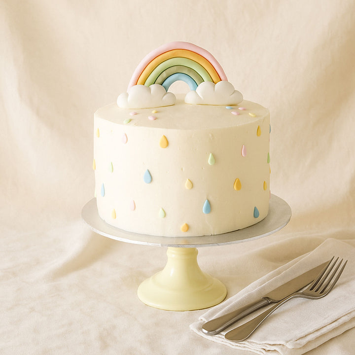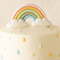 Design: Minimalist rainbow theme with pastel fudge rainbow topper, fluffy white clouds, and colorful raindrop decorations on smooth cream frosting