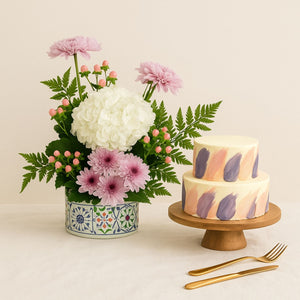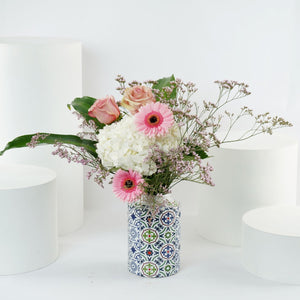 A vase with white hydrangea is a stunning floral masterpiece that adds a touch of elegance to any space. This arrangement features beautiful white hydrangea paired with roses and gerberas, carefully arranged in a tall, luxurious printed ceramic vase. It makes a perfect gift for special occasions or a sophisticated decorative piece for the home.