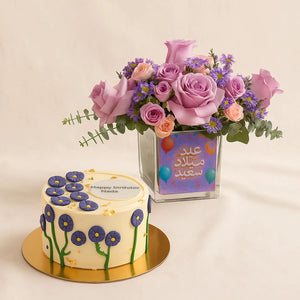 يضم ورود بنفسجية، وأغصان استر مذهل ، بالإضافة إلى ورد سويت سارا. يقدم هذا الباقة في فازة ورد خاصة بعيد الميلاد بحجم 12x12. يمكنك اضافة الكيك، الشوكولاتة أو غيرها من الهدايا اللطيفة، لتجعلها هدية مثالية في عيد ميلاد شخصك المفضل!