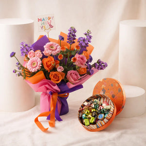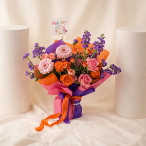 تجمع الباقة بين الجربيرا الوردية والورود الوردية مع ورود برتقالية مشرقة ولمسات من الورود الصغيرة، وتكتمل بسحر الماثيولا والستاتيس البنفسجي الداكن ليمنحها عمقًا وأناقة. تغليف متعدد الألوان مع أشرطة برتقالية وبنفسجية وملصق رأس السنة يجعلها هدية مثالية لمشاركة الفرح مع الأحباب.
