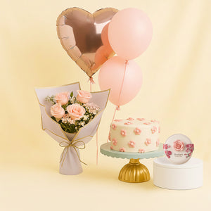 احتفل بأجمل اللحظات مع هذا الكومبو الوردي الرائع الذي يجمع بين الأزهار الفاخرة والبالونات الاحتفالية والكيك اللذيذ. يتكون التنسيق من ورود وردية ، مع لمسة ناعمة من زهرة الشمع الوردية، مرفق مع بالونات شكل قلب ويكتمل الاحتفال بكيك فاخر مزين بالورود، مثالي في أعياد الميلاد ، ذكرى الزواج و المناسبات السعيدة.
