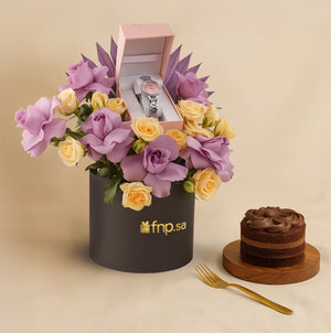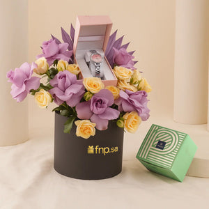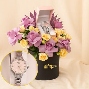 ابهر من تحبها بهدية تجمع بين الجمال والدقة – تنسيق ورد فاخر بدرجات اللافندر والكريمي مع ساعة تيتان نسائية راغا شوستوبر الفضية ذات تصميم ناعم وراقي. لمسة مثالية للمناسبات النسائية الفاخرة.