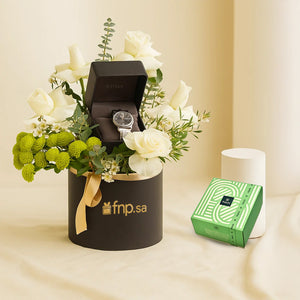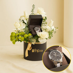 صندوق هدية أنيق من ساعة يد رجالية و بوكس ورد