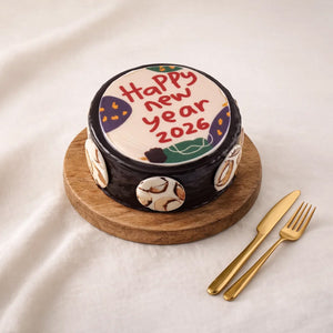 تصميم كيك مميز بتهنئة السنة الجديدة. قطعة مركزية مثالية للاحتفال مع العائلة أو الأصدقاء. حجمها المناسب يجعلها خيارًا رائعًا للمشاركة في اللحظات الجميلة وبداية عام مليء بالتفاؤل.